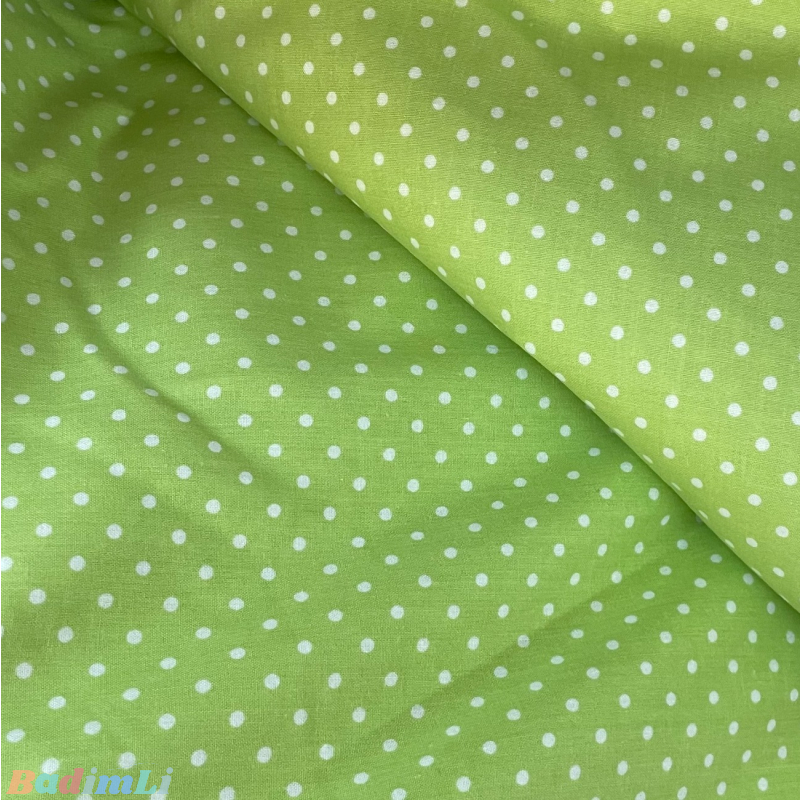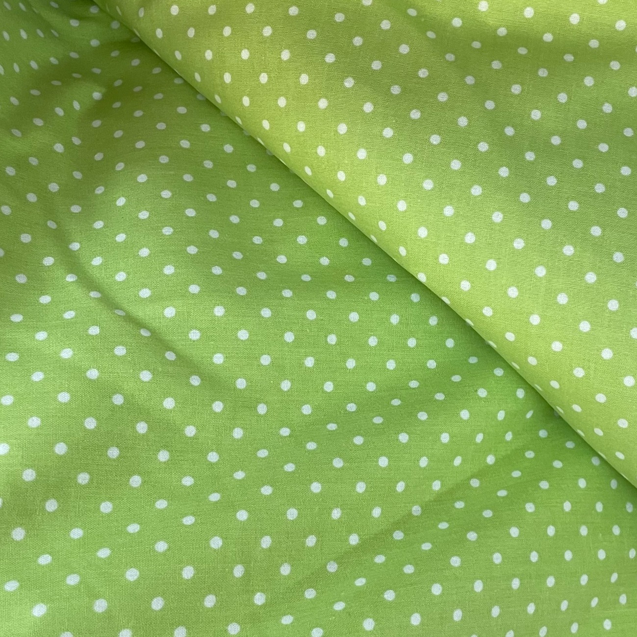 בד כותנה בצבע ירוק בהיר עם הדפס נקודות לבנות קטנות.