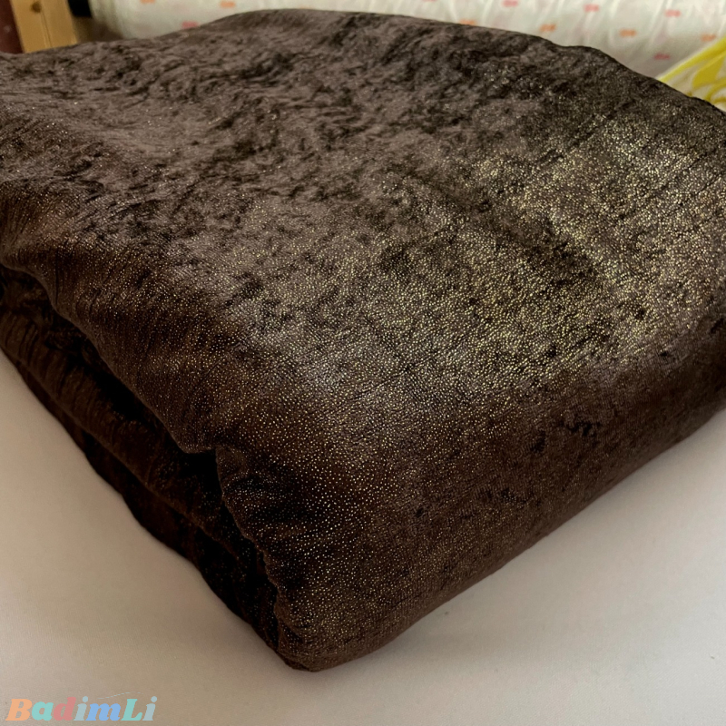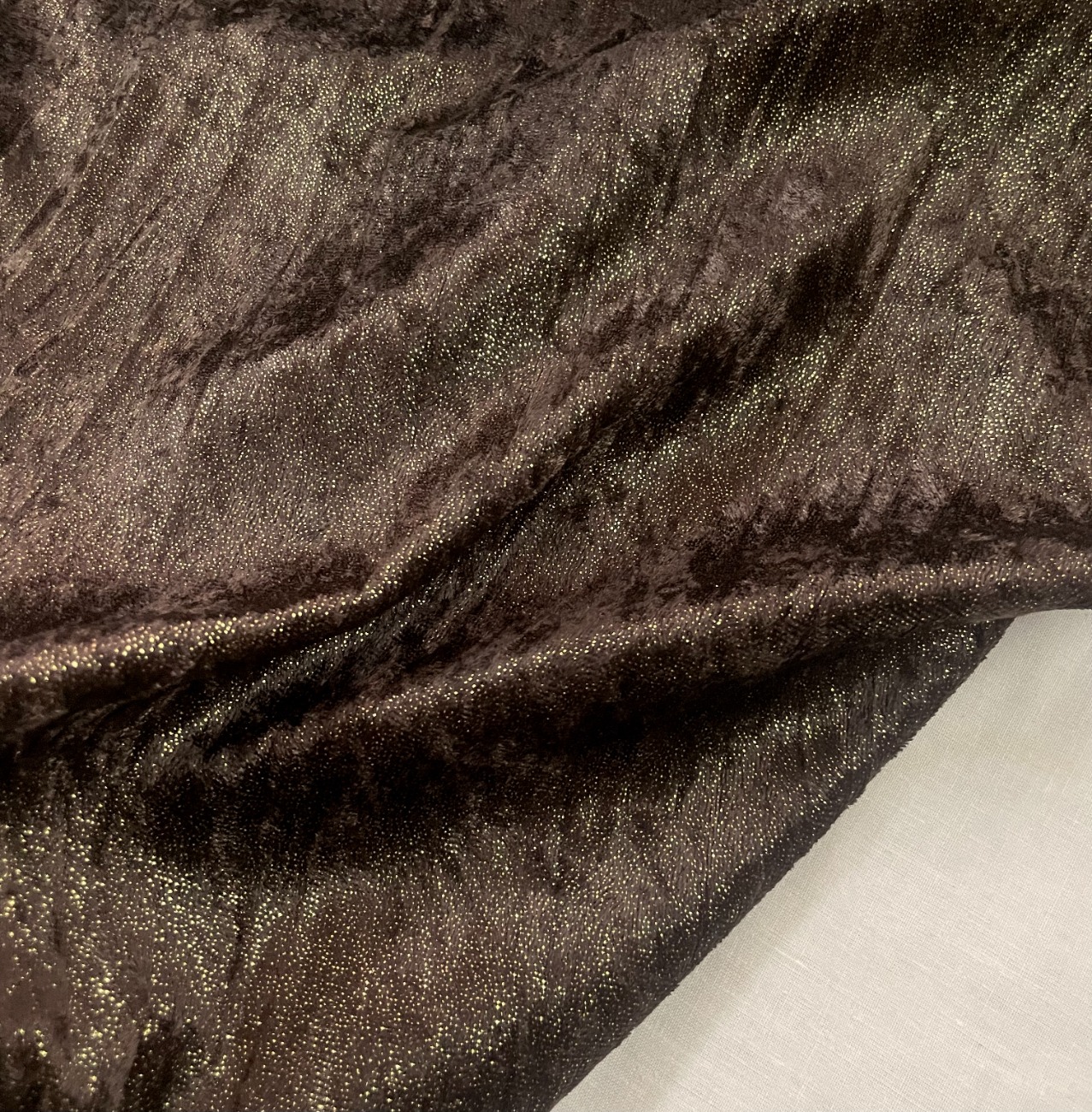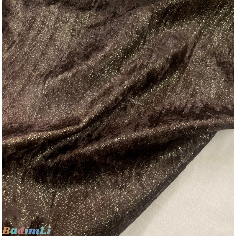 בד קטיפה מקומטת בצבע חום כהה עם נקודות לורקס בצבע זהב.בד קטיפה בסיסי בעל מרקם לא אחיד. יכול להתאים לכיסויים שונים, תחפושות, תפאורה, מפות ועוד..